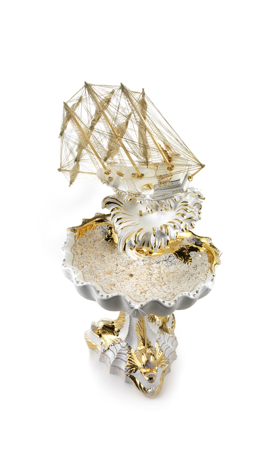 Il lampadario rispecchia di luce propra grazie all'accostamento di materiali sfarzosi quali oro e swaroski che ammalieranno lo sguardo di chi lo osserva. The chandelier mirrors its own light thanks to the combination of sumptuous materials such as gold and swaroski that bewitch the observer's gaze. |